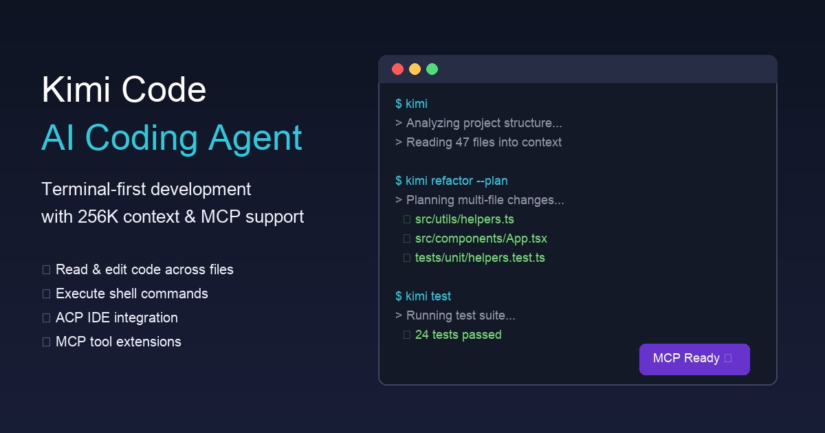 Discover Kimi Code CLI — an open-source AI coding agent for your terminal. Learn how to install, configure, and use it with ACP IDE integration, MCP tool extensions, and long-context workflows.